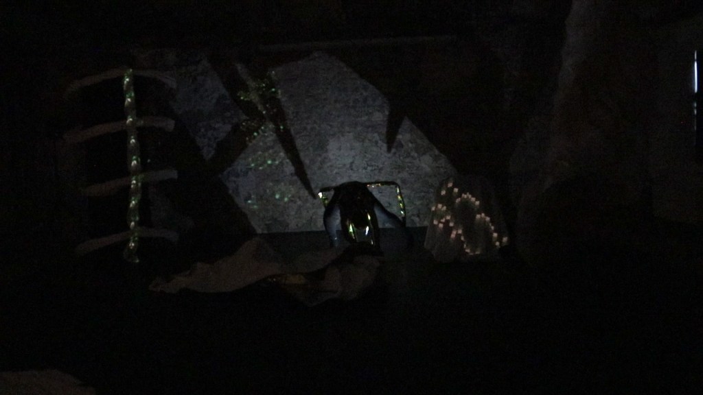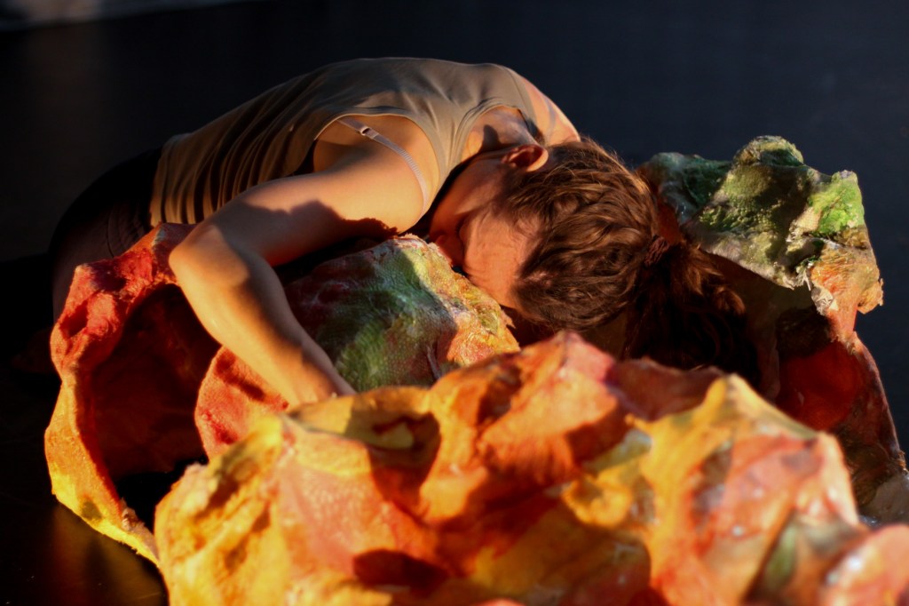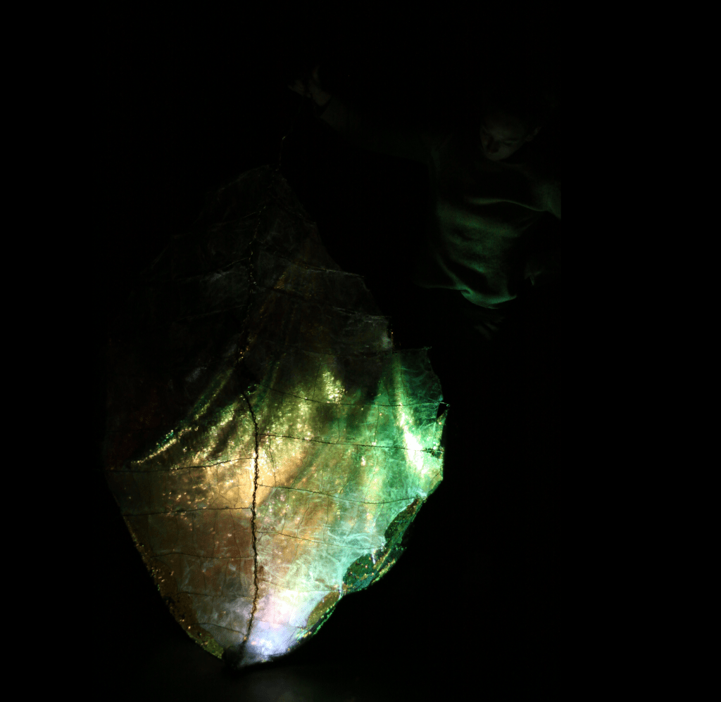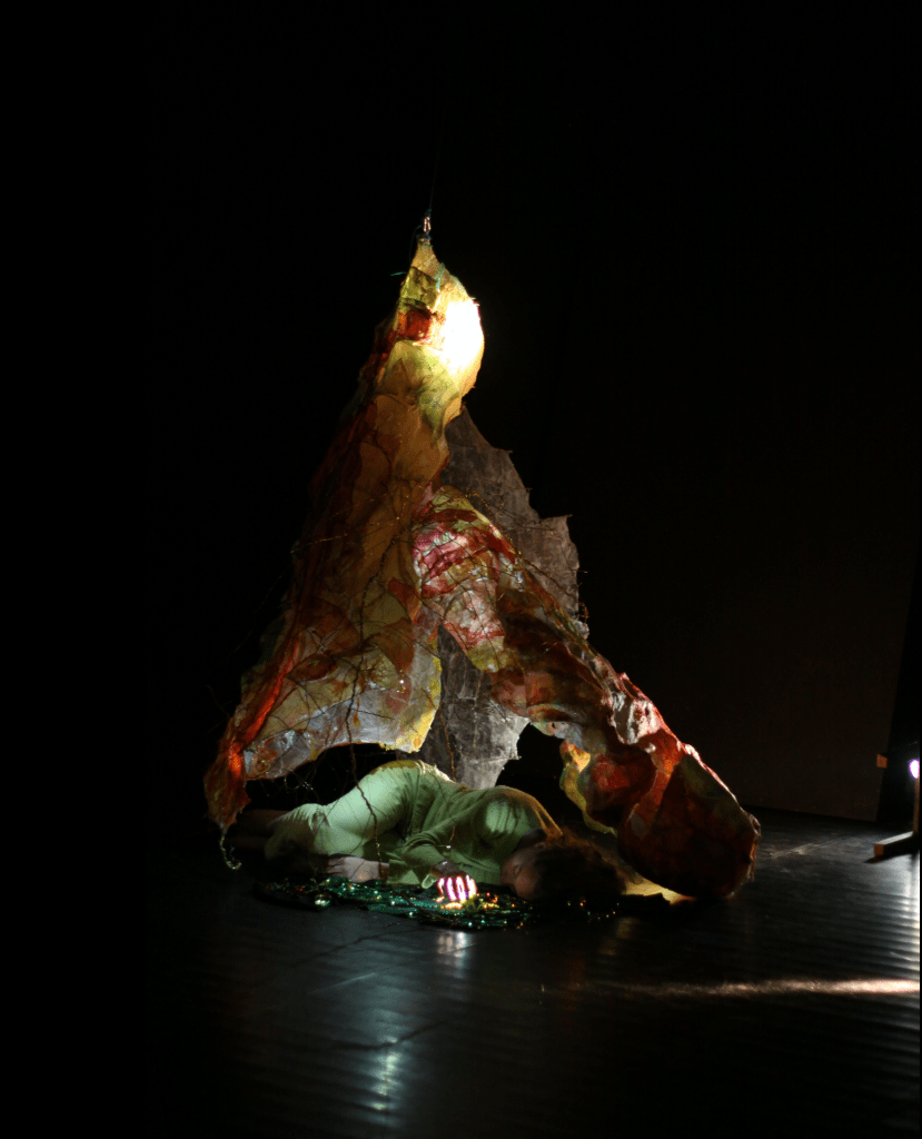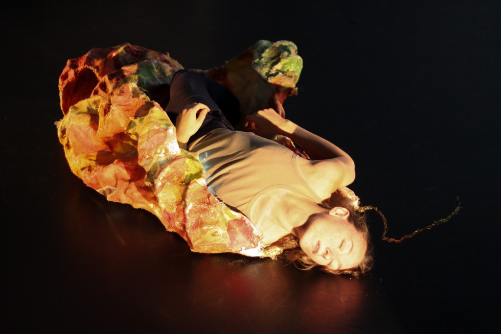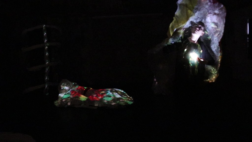 Nous souhaitons monter un spectacle de danse insectoïde enrobé de mues, par le mariage des arts visuels et des arts vivants. C’est un spectacle qui parle de l’imbrication des êtres et de leur dissolution dans le paysage. Le costume, le son, et le mapping nous permettent de traverser d’un monde à l’autre, en métamorphosant à la fois le décor et le corps. Les mouvements de danse font allusion à ceux d’animaux. Le décor est vivant, il est tantôt animé par le mapping, tantôt par la danseuse. Il finit par engloutir cette dernière, qui se retrouve dans le ventre d’un serpent. Les sons imitent le vivant et brouillent les repères entre réel et imaginaire. Le costume joue un rôle important, il permet au corps de perdre son apparence humaine, et de re-composer d’autres entités.