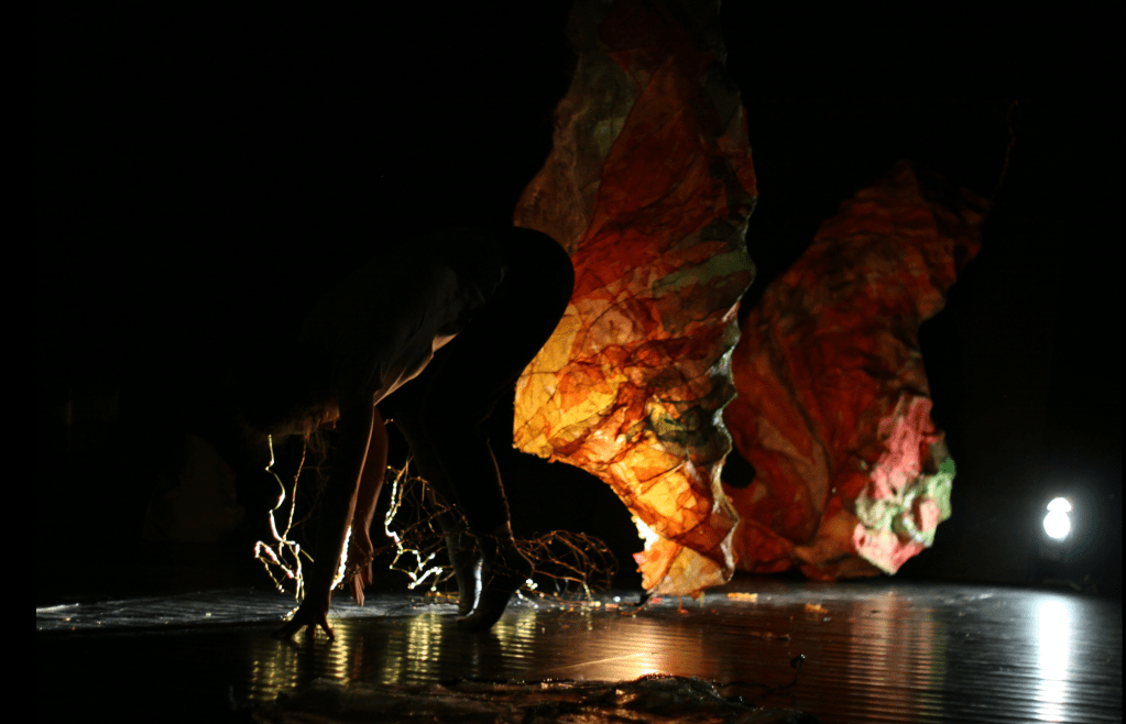 Le spectacle évolue à travers des jeux entre le visible et l’invisible, et les liens qui existent entre la présence, la forme et l’identité du corps. Celui-ci émerge alors dans un monde obscur où interagissent une multitude d’êtres. Il devient présence. À la lumière, la danseuse se retrouve dans un monde de proies et de prédateurs. Le paysage peut à son tour se changer: une écorce se transforme en fourmilière, les feuilles se changent en plantes carnivores et un tronc se mute en serpent.